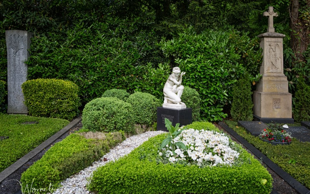 Diese wundervolle Skulptur auf der Grabstätte von Diethelm Hoener hat mich neugierig gemacht, ein klassischer Akt in Perfektion. Ein absolutes Meisterwerk, so realistisch wie ein Foto. Leider habe ich bisher keine Angaben zu dem Bildhauer finden können, aber den Namen Diethelm Höner habe ich schon mal gehört, da war doch mal was mit einem tödlichen Treppensturz.