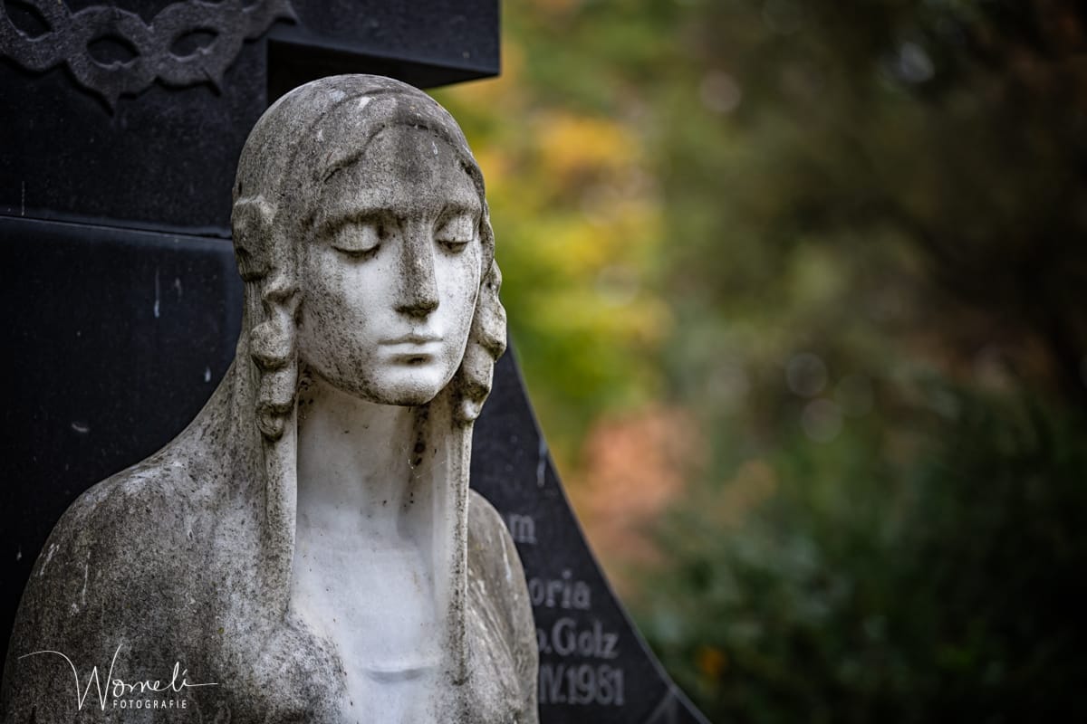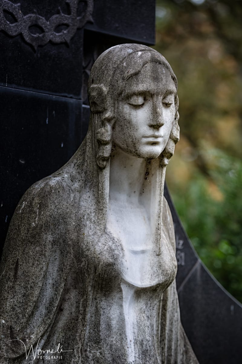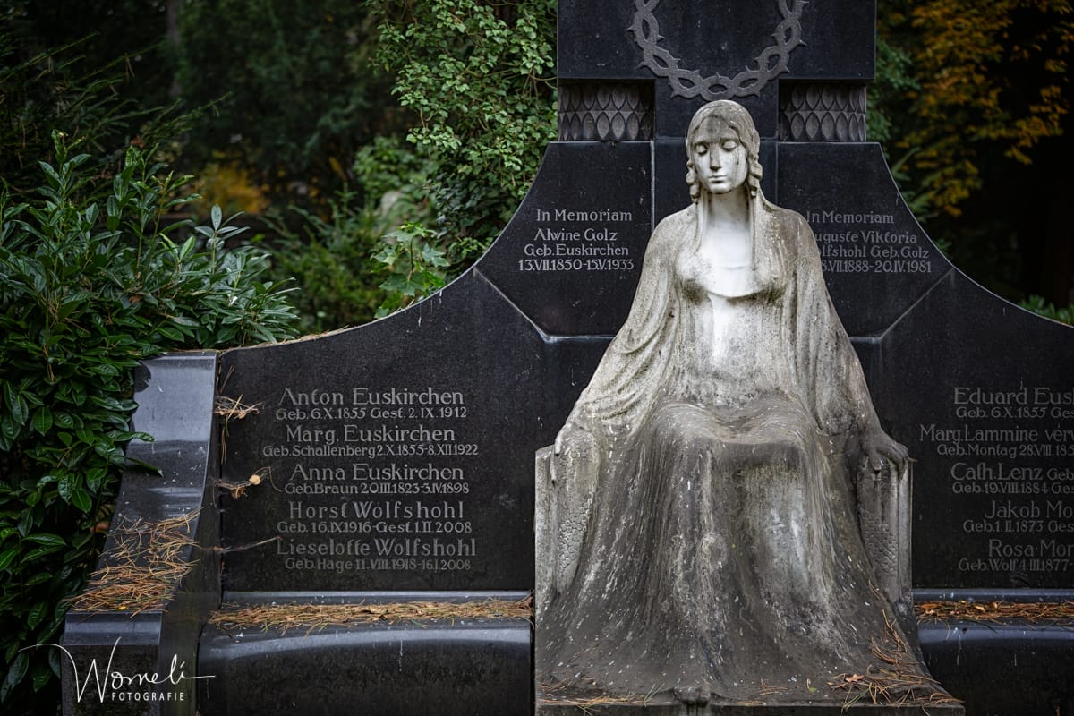 Die sitzende Frauenfigur aus weißem Marmor ähnelt sehr dem Grabmal Brandt von Wilhelm Fassbinder. Die Skulptur ist signiert mit dem Namen des Bildhauers Moest, hier kann eigentlich nur Josef Moest gemeint sein, weil sein Vater Richard Moest bereits am 01.08.1906 in Köln verstarb. Es ist aber auch denkbar das die Skulptur von Richard Moest begonnen und von Josef Moest fertig gestellt wurde, daher nur die Signatur Moest.